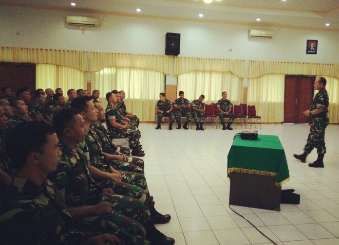 Condet – Danrindam Jaya Kolonel Inf Anton Yuliantoro memberikan materi proxy war kepada 50 peserta Penataran Babinsa (Bintara Pembina Desa) di Ruang Gatot Subroto, Rindam Jaya, Condet, Jakarta Timur, Sabtu (30/09/2017).