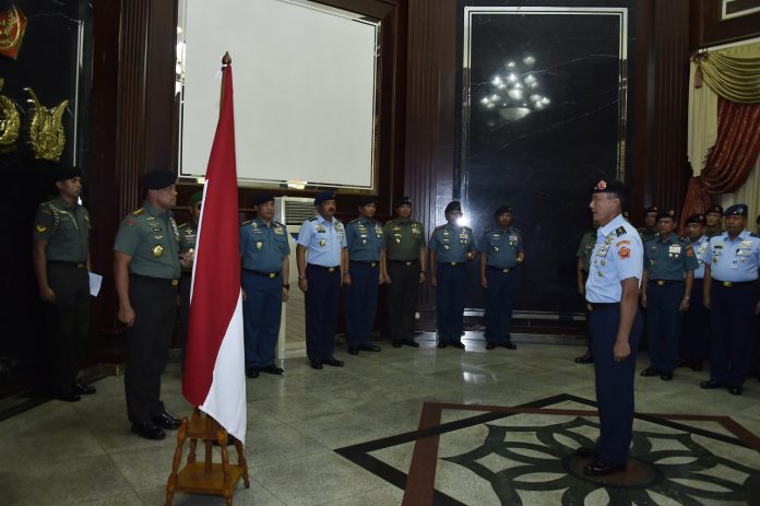 Jakarta Pusat – Panglima TNI Jenderal TNI Gatot Nurmantyo didampingi Kasad Jenderal TNI Mulyono, Kasal Laksamana TNI Ade Supandi dan Kasau Marsekal TNI Hadi Tjahjanto, menerima laporan korps dan melantik kenaikan pangkat delapan Perwira Tinggi (Pati) TNI, di Kantor Panglima TNI, Jl. Merdeka Barat No.2, Jakarta Pusat, Jumat (06/10/2017).