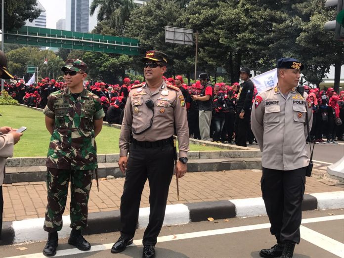 Gambir – Personel Kodim 0501/JP BSĀ membantu aparat Kepolisian Resort Metro Jakarta Pusat dalam mengawal dan mengamankan aksi demo dari Konfederasi Serikat Pekerja Indonesia (KSPI), di sekitar jalan Medan Merdeka Barat, Gambir, Jakarta Pusat, pada Sabtu (07/10/2017).
