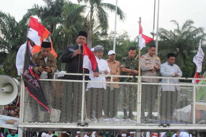 Para Demonstran terlihat merasa senang dan bangga bisa melaksanakan Sholat Berjamaah bersama dengan anggota TNI-Polri yang turut membantu mengawal aksi mereka tersebut. (ferry)