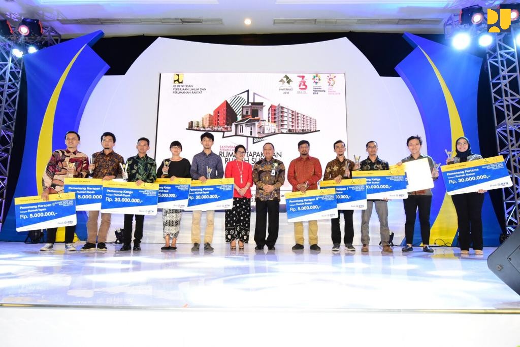 Jakarta, inventori – Kementerian Pekerjaan Umum dan Perumahan Rakyat (PUPR) memberikan penghargaan kepada para pemenang Sayembara Desain Rumah Tapak dan Rumah Susun Bersubsidi 2018. Penyerahan penghargaan dilakukan oleh Dirjen Pembiayaan Perumahan Lana Winayanti mewakili Menteri PUPR M Basuki Hadimuljono pada acara pembukaan Indonesia Property Expo 2018 di Jakarta Convention Center, Minggu, 23 September 2018.