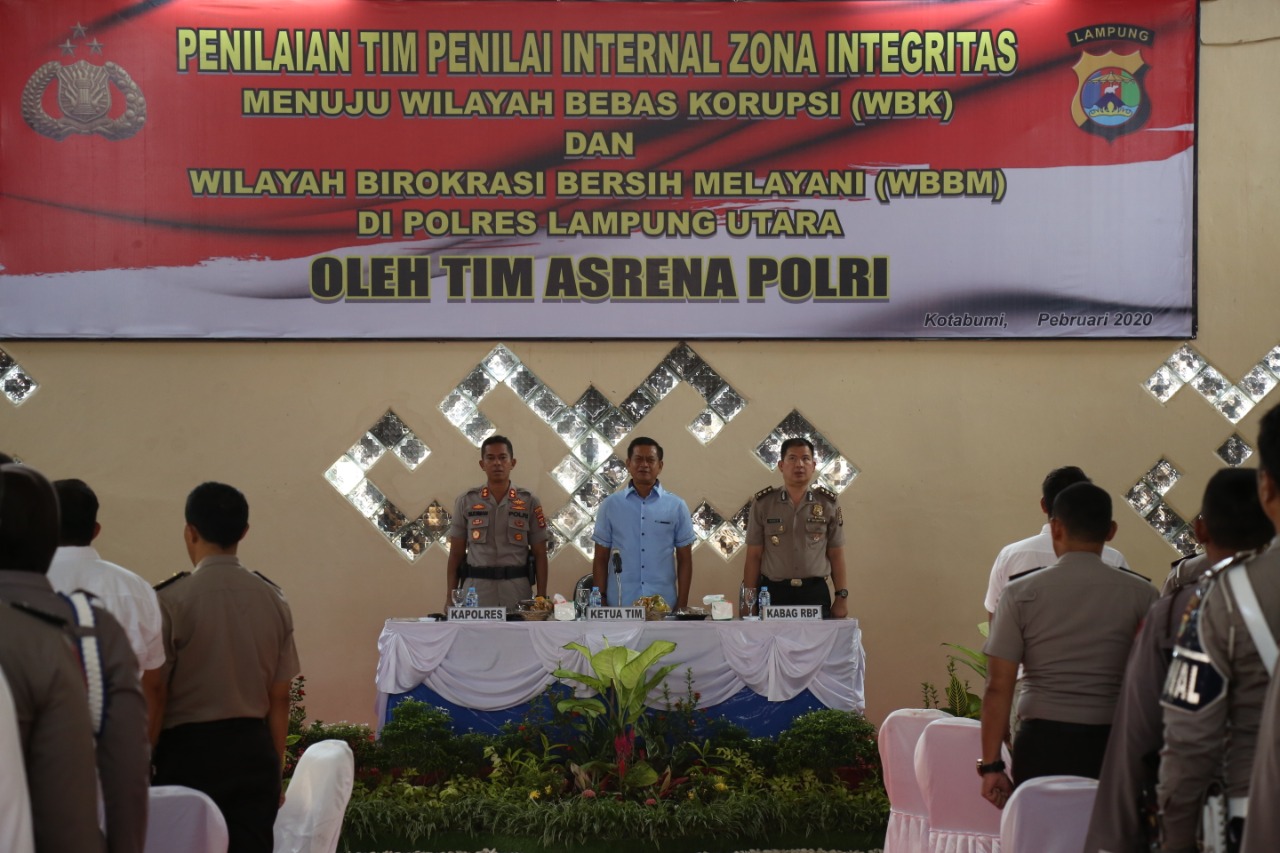 INVENTORI.CO.ID – Lampung Utara – Dalam rangka penilaian Zona Integritas (ZI) menuju Wilayah Bebas Korupsi (WBK) dan Wilayah Birokrasi Bersih dan Melayani (WBBM) Tahun 2020, Polres Lampung Utara menerima kunjungan Tim Penilai Internal (TPI) Mabes Polri, Rabu (12/02/2020).