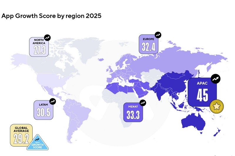 Kawasan Asia Pasifik menahbiskan dirinya sebagai pemimpin dunia dengan mencatatkan Growth Score fantastis: 45, jauh melampaui rata-rata global 29,2. Angka ini menegaskan kombinasi kuat antara volume instalasi besar, biaya akuisisi yang efisien, dan keterlibatan pengguna yang intens di kawasan ini.